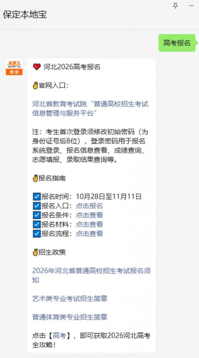 温馨提示:微信搜索公众号【保定本地宝】,关注后在对话框回复【高考报名】即可获取河北高考信息管理与服务平台、报名/确认/缴费官网入口、时间+条件+流程、常见问题解答等